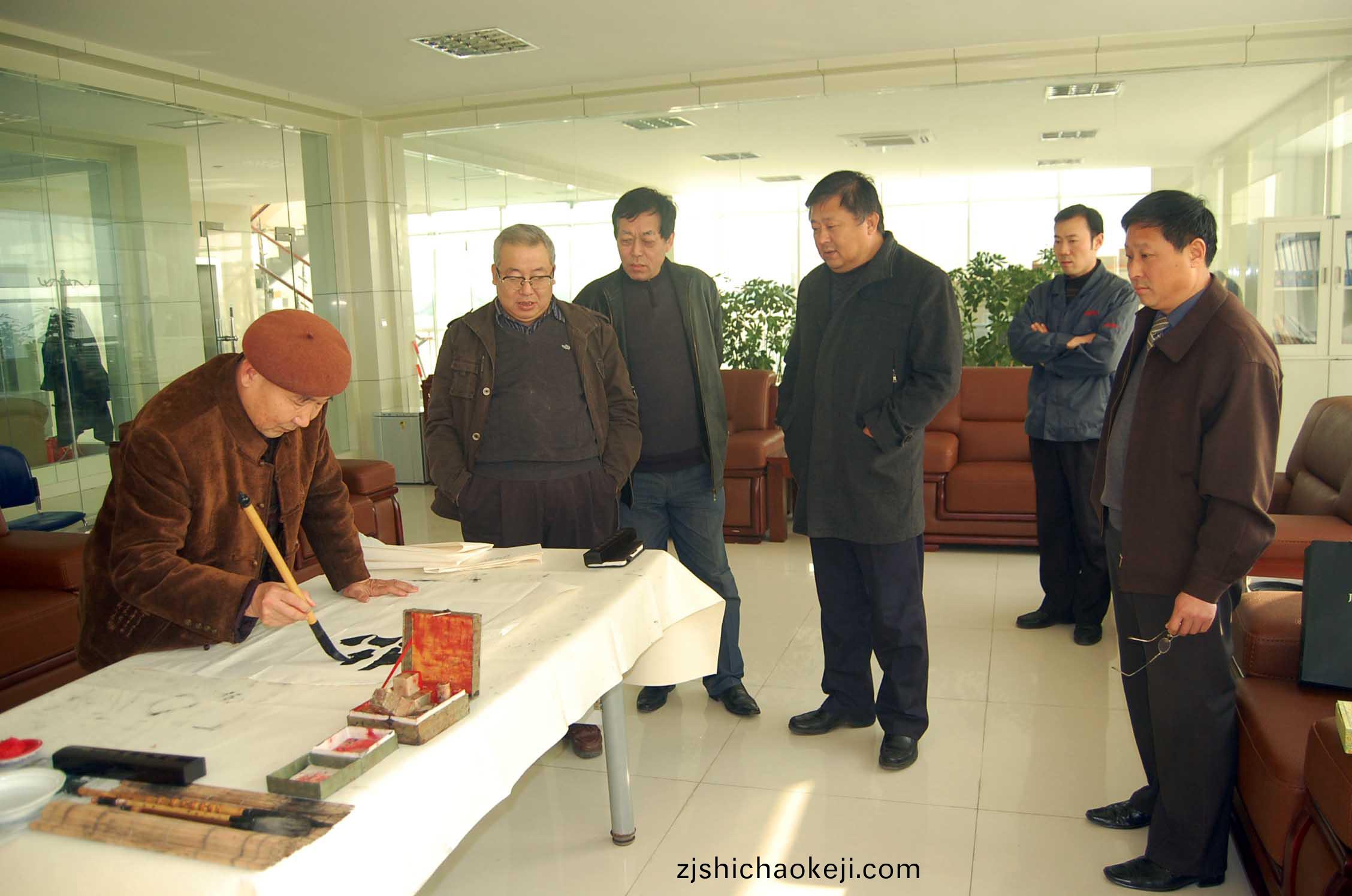圖爲公司董事(shi)長(zhang)、總經理康(kang)鳳明(ming)、副(fu)總經理(li)郭(guo)傢榮(rong)等領(ling)導(dao)現場觀看(kan)耿(geng)老(lao)作書(shu)。